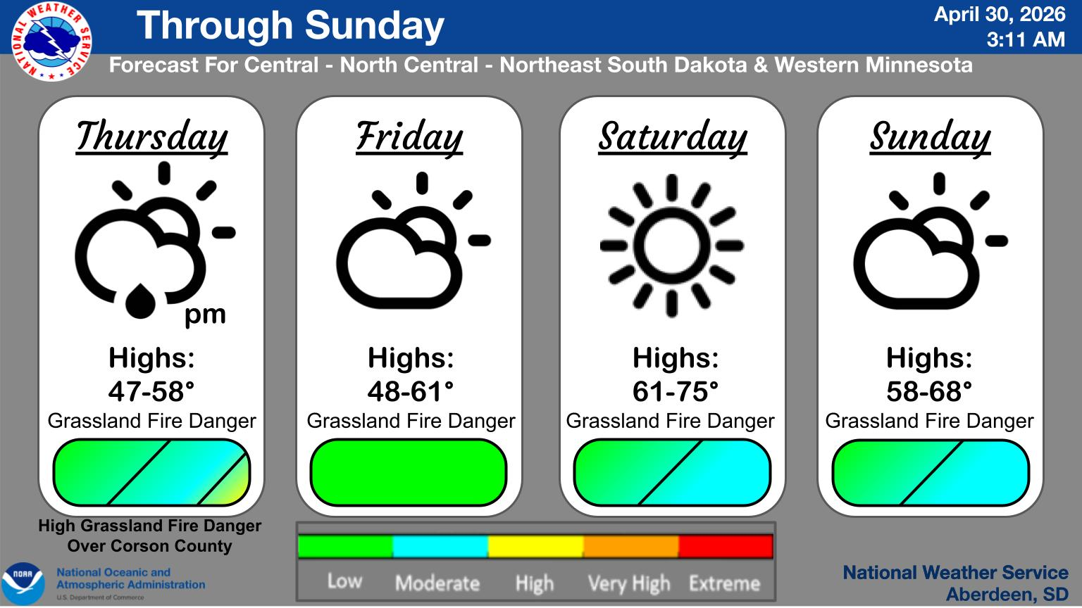Temperatures today will top out in the upper 70s and 80s. Winds will be out of the west gusting 25 to 35 mph. The strong winds, dry grasses and other fuels, and relative humidity falling to 15 to 30 percent will result in High to Very High Grassland Fire Danger. A Red Flag Warning is in effect this afternoon for portions of central South Dakota.