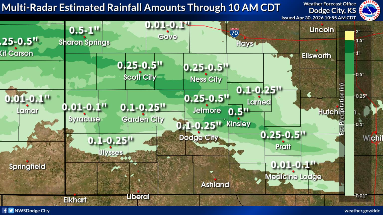 An axis of light to moderate rain remained positioned along a west-northwest to east-southeast axis extending from roughly Scott City down through Jetmore to Ness City, continuing down to Kinsley to Pratt. Along this axis, radar estimated between one-quarter and one-half of an inch of rain with some locally higher amounts above one half inch.