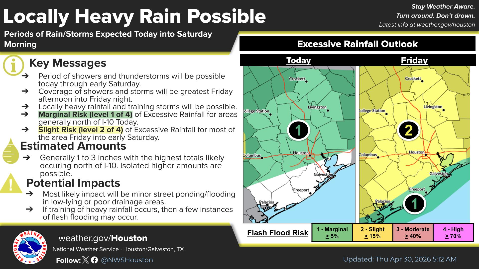 Periods of showers and thunderstorms are expected today through early Saturday, with the greatest coverage Friday afternoon into Friday night. Locally heavy rainfall and training storms are possible. A Marginal Risk (level 1 of 4) for Excessive Rainfall is present today north of I-10, increasing to a Slight Risk (level 2 of 4) Friday into early Saturday for most of the area. Total estimated amounts are generally 1 to 3 inches, primarily north of I-10. Minor street flooding is the most likely impact, but a few instances of flash flooding are possible if training heavy rainfall occurs.
