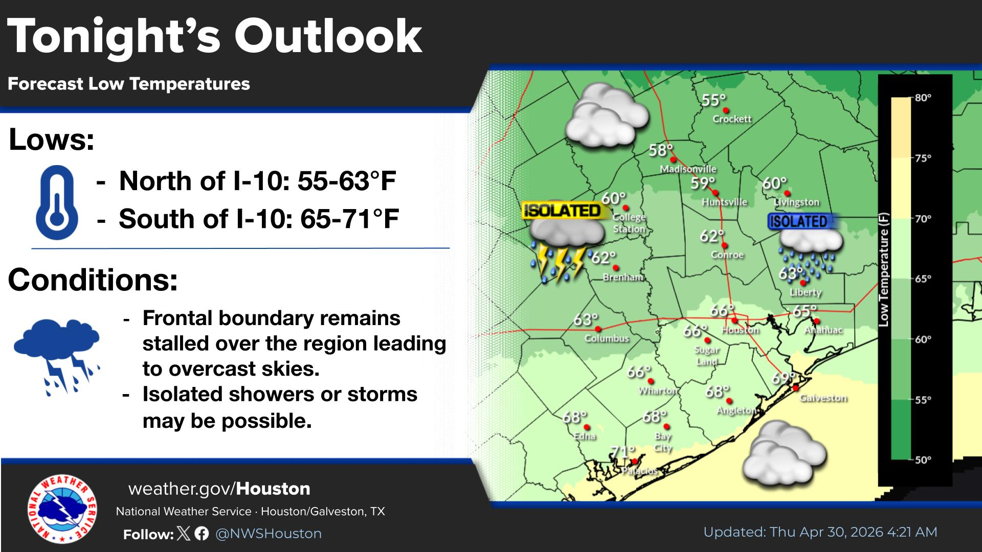 The stalled frontal boundary will remain over the region tonight, leading to mostly overcast skies and the possibility of isolated showers or storms. Forecast low temperatures are 55-63°F north of I-10 and 65-71°F south of I-10.