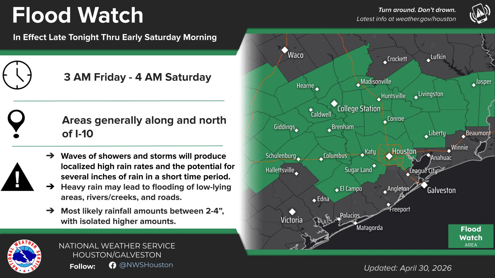 A Flood Watch will be in effect from 3 AM Friday - 4 AM Saturday for areas generally along and north of I-10. Waves of showers and storms will produce localized high rain rates and the potential for several inches of rain in a short time period. Heavy rain may lead to flooding of low-lying areas, rivers/creeks, and roads. Most likely rainfall amounts between 2-4”, with isolated higher amounts.