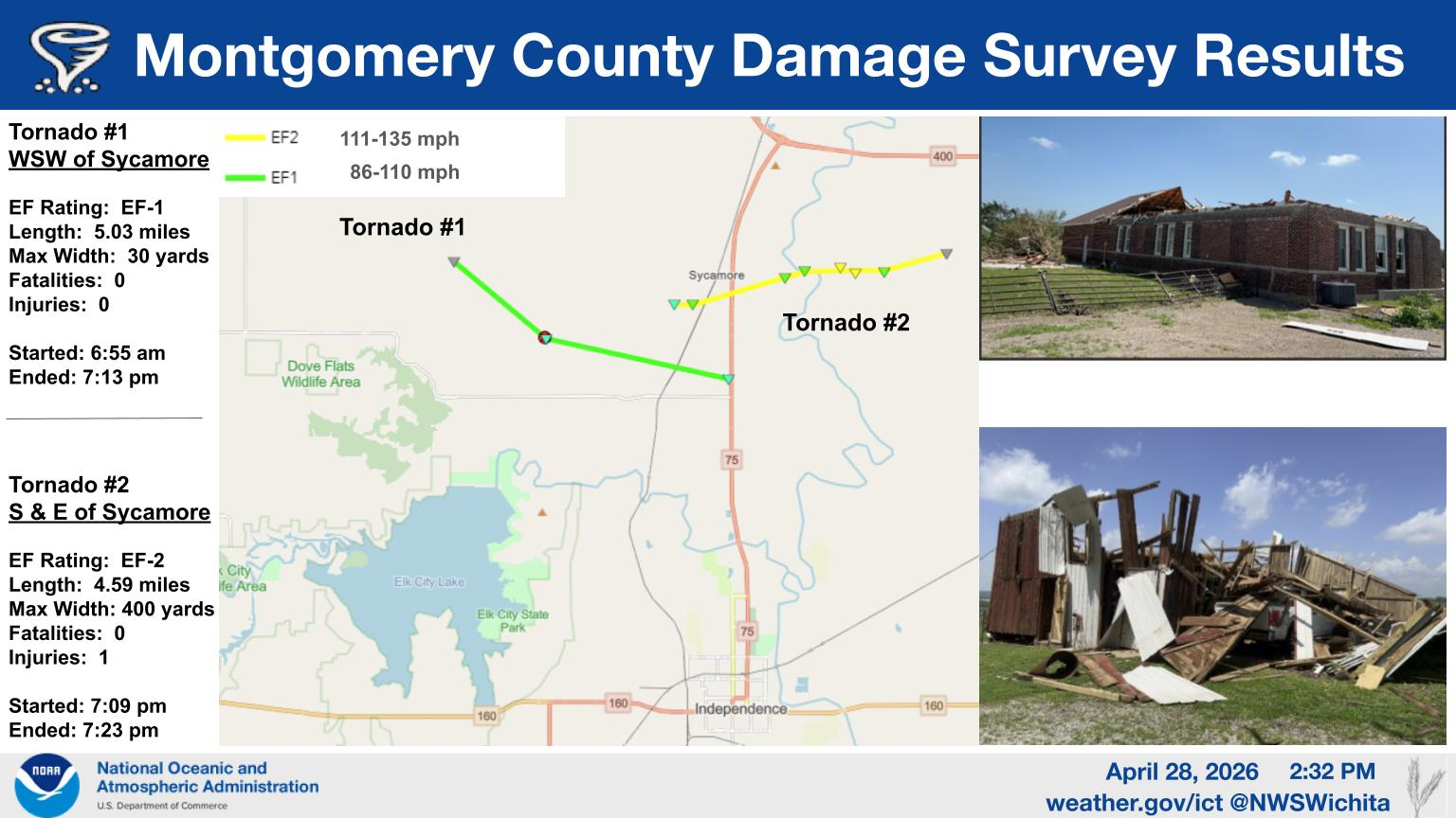 A supercell thunderstorm that developed over Montgomery County Kansas on the evening of April 26 produced two tornadoes near Sycamore, Kansas. The peak rating was EF2 which occurred with the tornado east of Sycamore where 1 injury was reported.